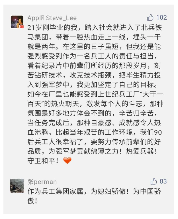 作為新時代弘揚人民兵工精神的特色文化成果,紀錄片的播出,凝聚起廣大兵器干部職工團結奮斗新時代磅礴力量,極大的增強了兵工人的自豪感,大家紛紛表達了作為軍工央企一員 “此生無悔入軍工”的使命擔當......