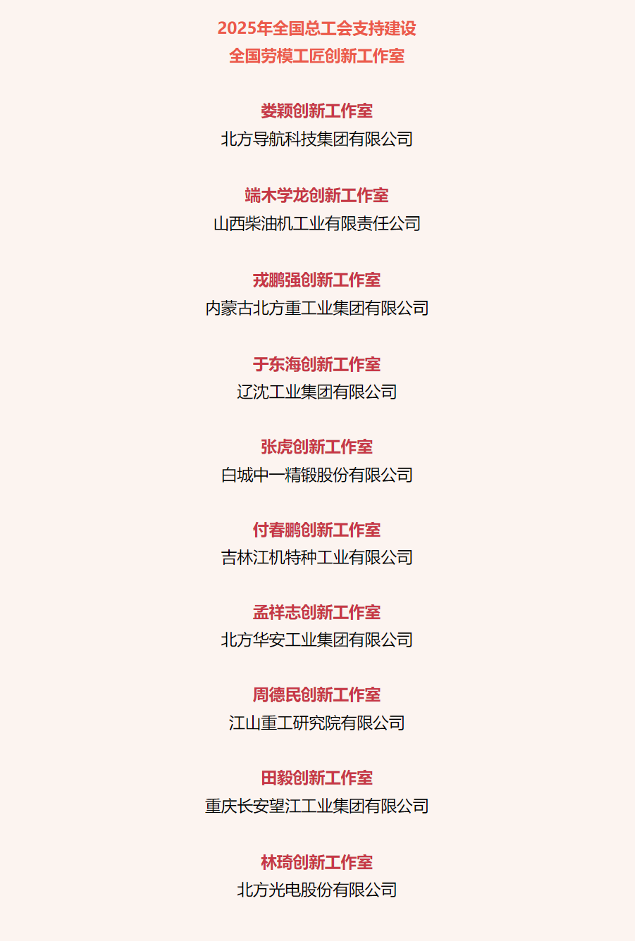 近日,中華全國總工會公布2025年全國總工會支持建設全國勞模工匠創新工作室名單,兵器工業集團10個勞模工匠創新工作室獲全國總工會支持建設。